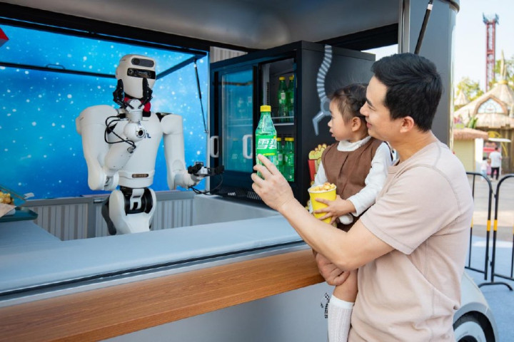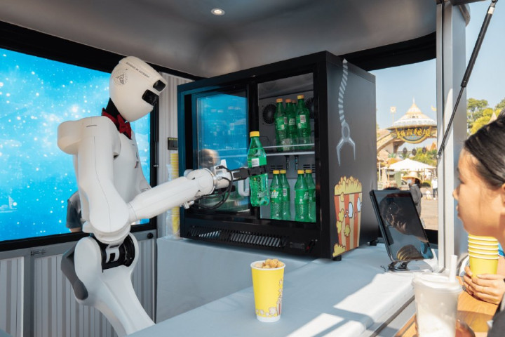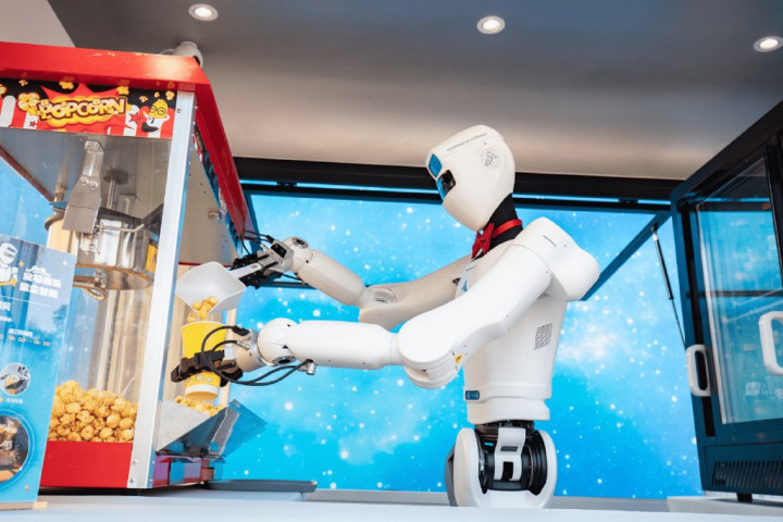 在中山奇遇时光乐园现场,金马游乐与星尘智能共同研发的机器人零售服务店中,展示了全场最忙碌的“店员”。它能流畅地与顾客互动,独立完成从语音接待、下单支付、精准铲放爆米花、抓取饮料、商品递送等一系列复杂操作——像人一样敏捷和丝滑。